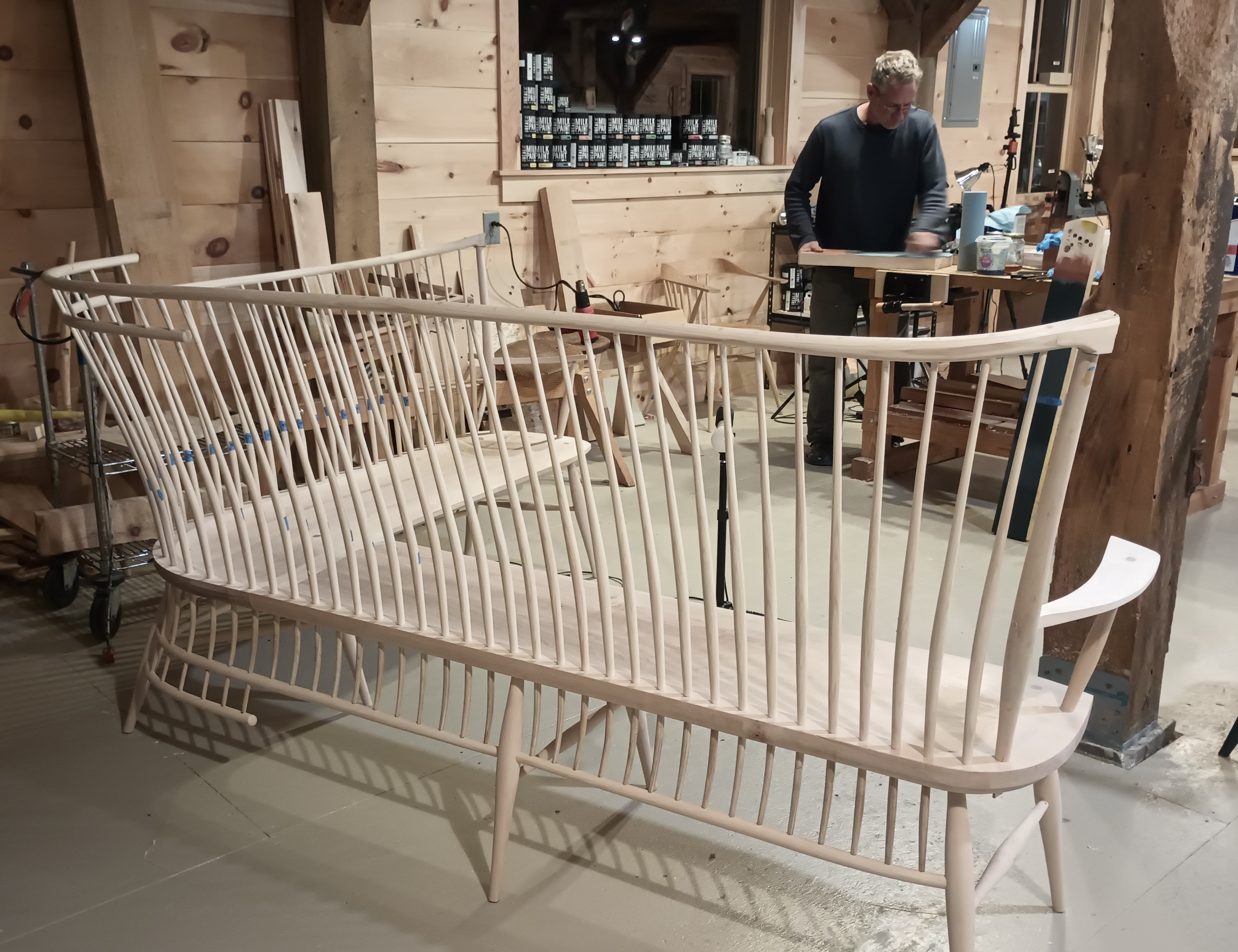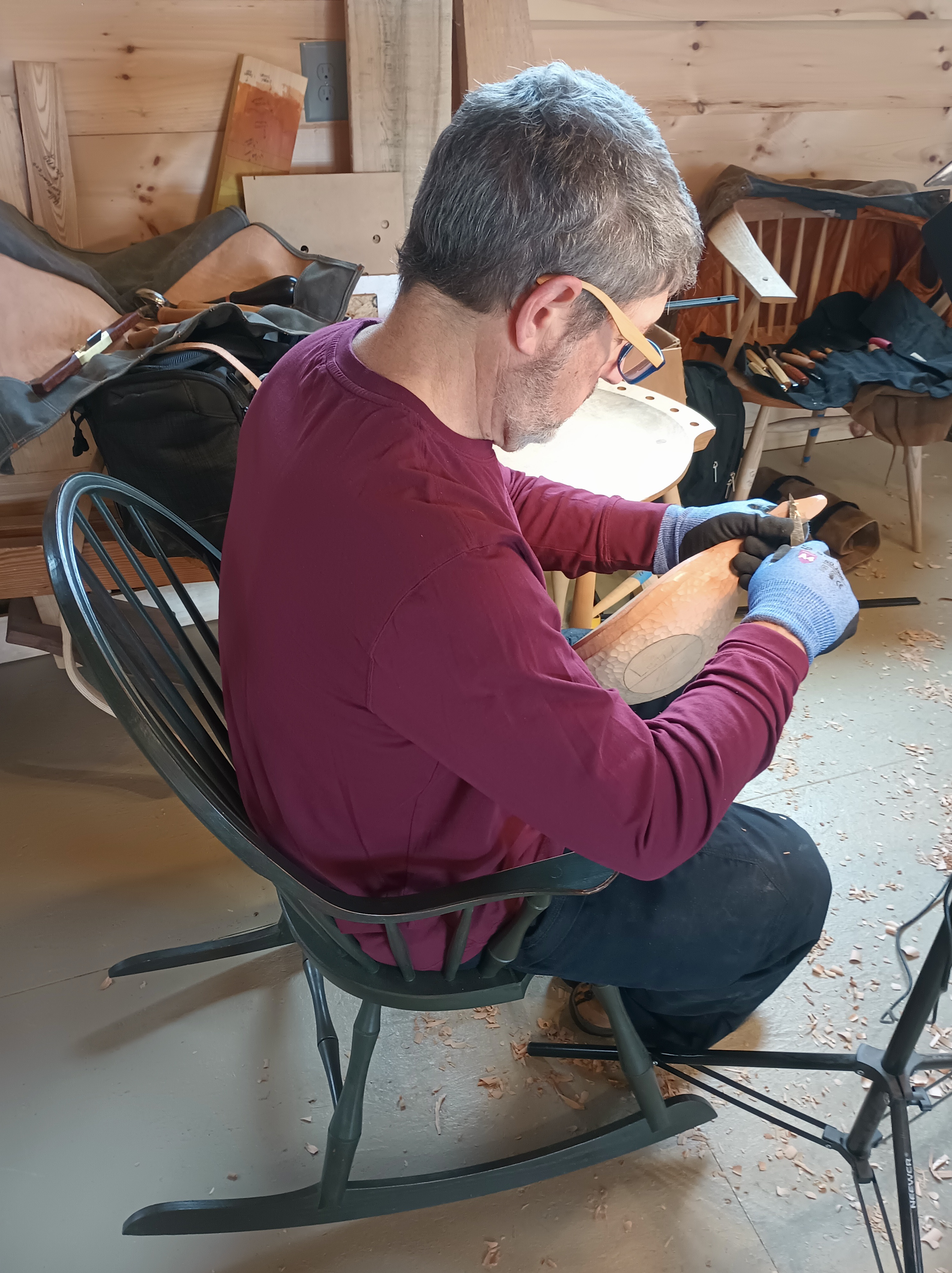 You may have noticed in some of the shots that chairs and stools made by Pete are all around. Lew found a good spot to sit and carve in a continuous arm rocker.