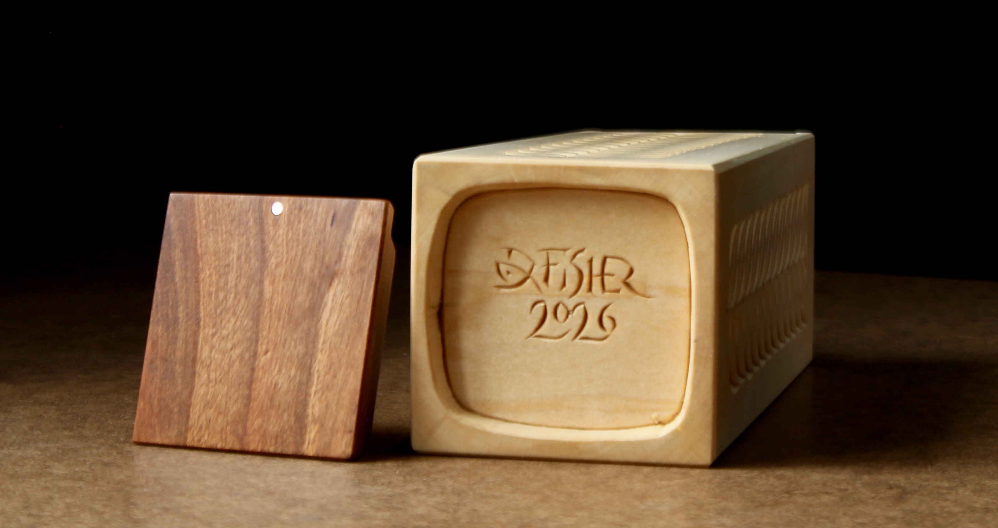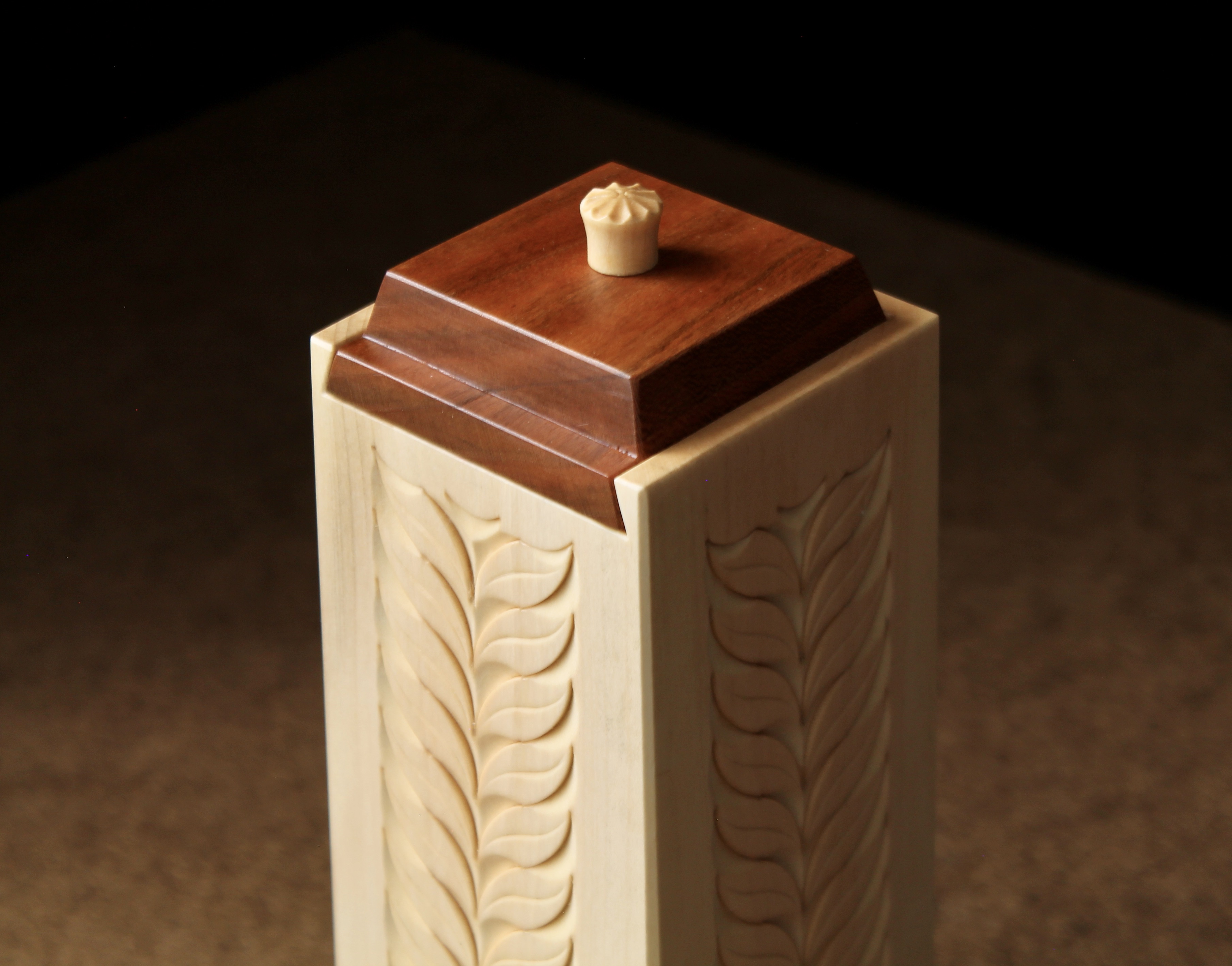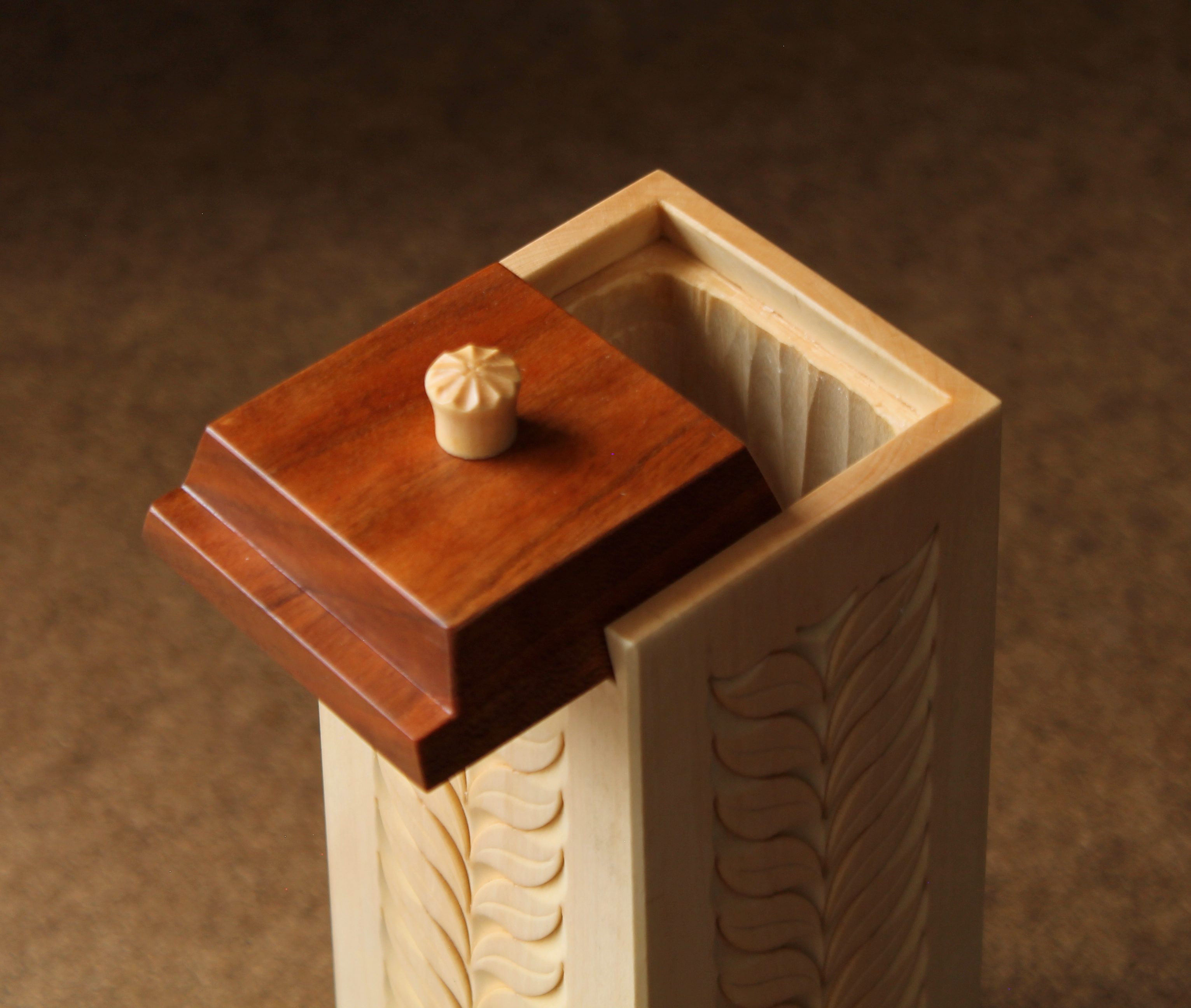 It was a painstaking challenge to carve the dovetailed area at the top of the inner walls, but it worked out well. The inside of the pot has a gouged surface (unfinished) and is square like the outside of the pot, but with rounded inner corners. There is a taper to the piece overall; the top is 1/4″ smaller than the base. When the lid is almost closed, a pair of matching magnets in the top of the front wall engage to finish the job with a satisfying little pull and click.