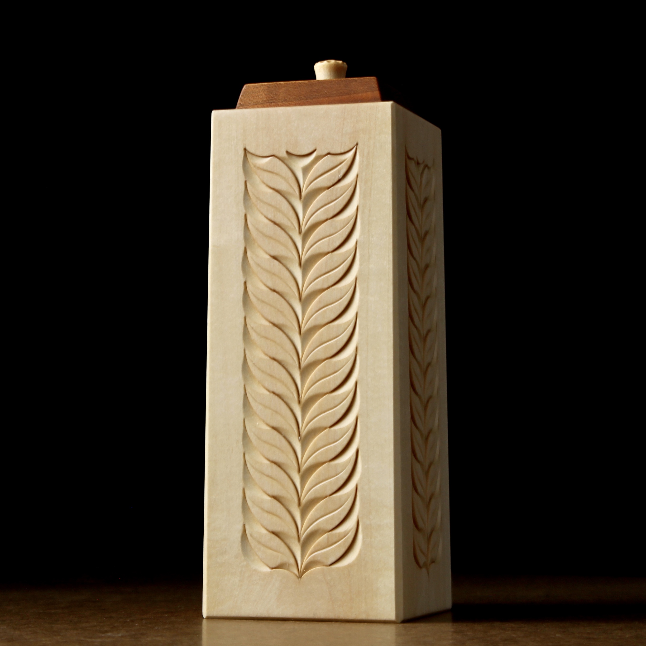 This one is for sale. It is 8 1/2″ tall and 3 1/8″ square at the base. The leaf pattern is carved on all four sides. The price of $650 includes shipping. Email me at dandkfish@gmail.com if you’re interested. Thank you. SOLD