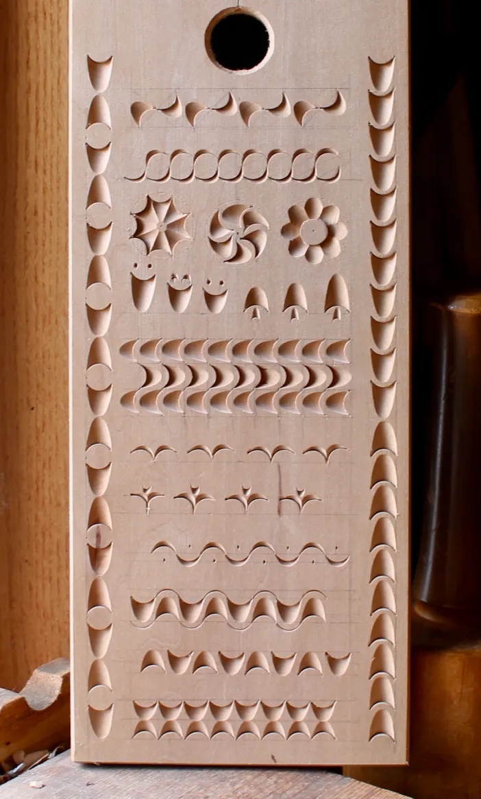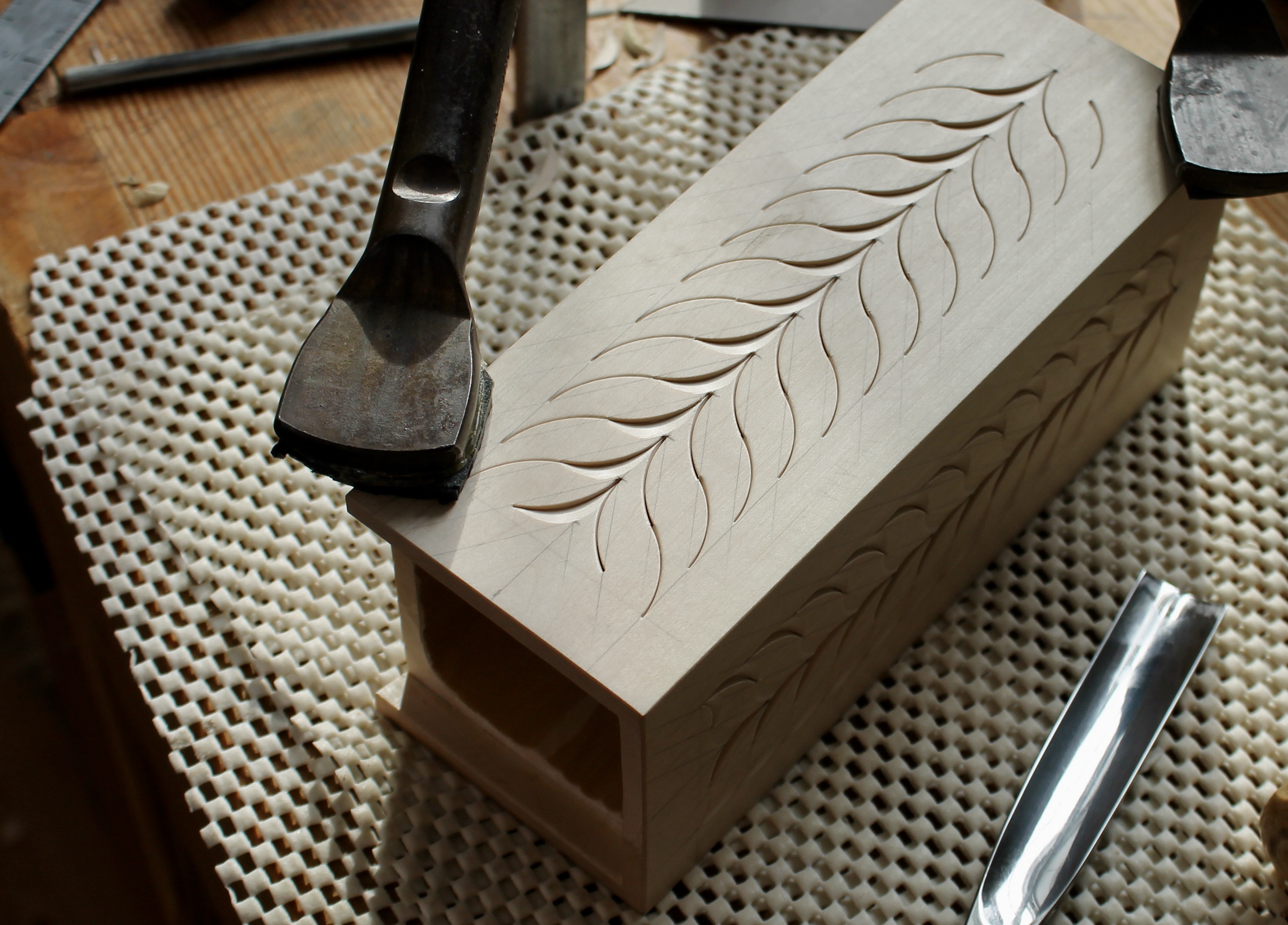 The pattern is made up of a series of thumbnail cuts, where one makes a vertical stab cut then a back cut at an angle to the root of it to remove a chip. Simple idea, but one that offers a wide range of design possibilities by playing with three main variables: the sweep of the gouge, the distance of the back cut, and the arrangement of all the cuts.