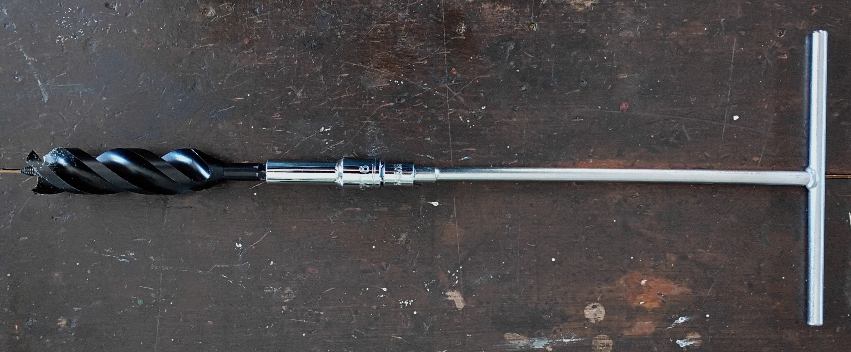 I experimented with an idea suggested by my friend Roberto to use the bit in a T-handle arrangement. It uses a T-handle socket driver with a deep 7/16″ socket. Wood handles could be added. But I never got that far, because there’s too much play in the joints. You could weld things together, I suppose. Or, just use a 1/2″ electric/cordless drill.