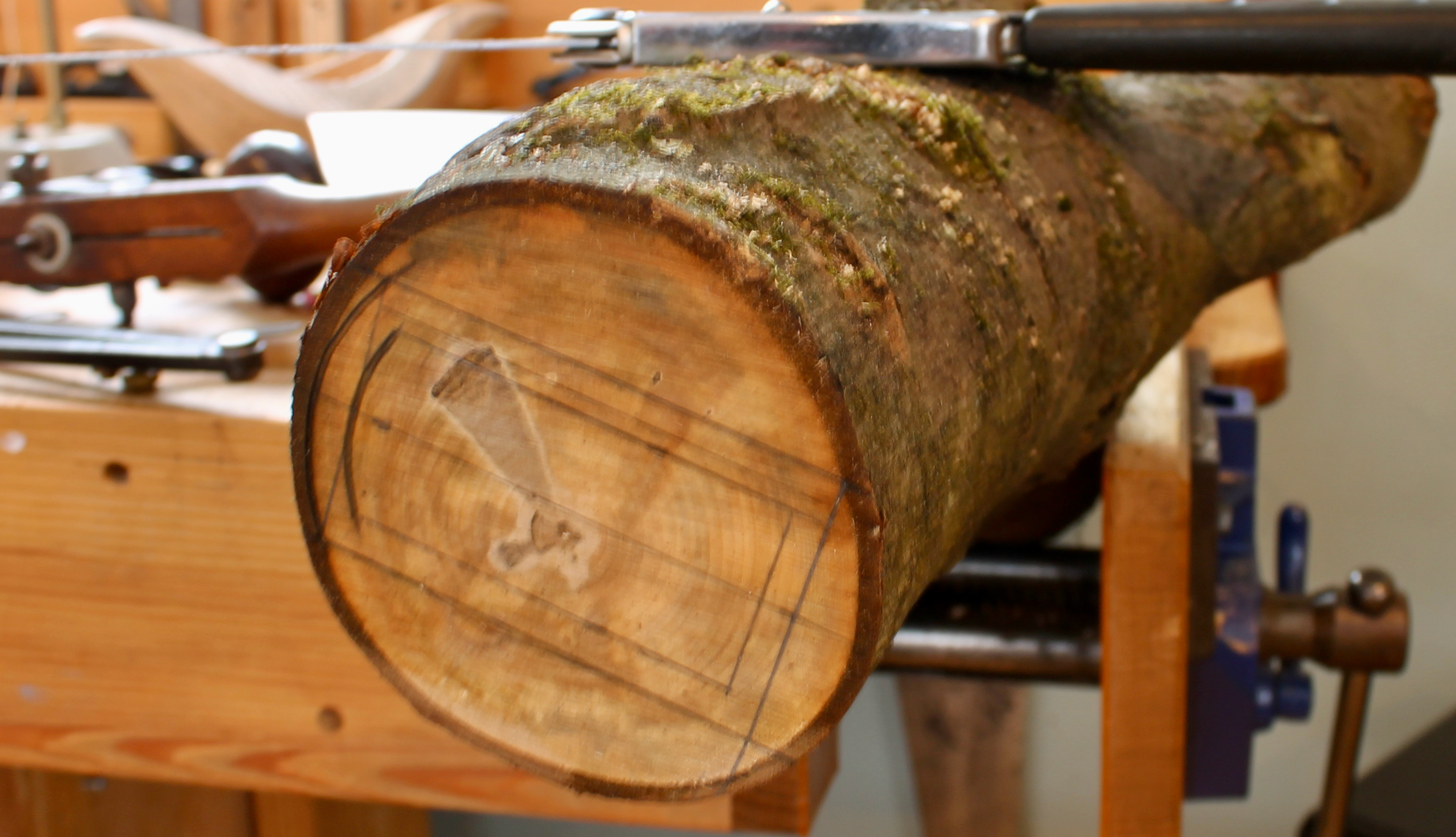 Above, I’ve sketched some lines on the end grain surface of a maple log. It’s still green, but not super fresh. This will be for a shrink book, a shrink pot in the form of a book. It’s a relatively small one, so the 1 1/4″ bit will be ideal for drilling a series of three holes to begin the excavation of the interior.