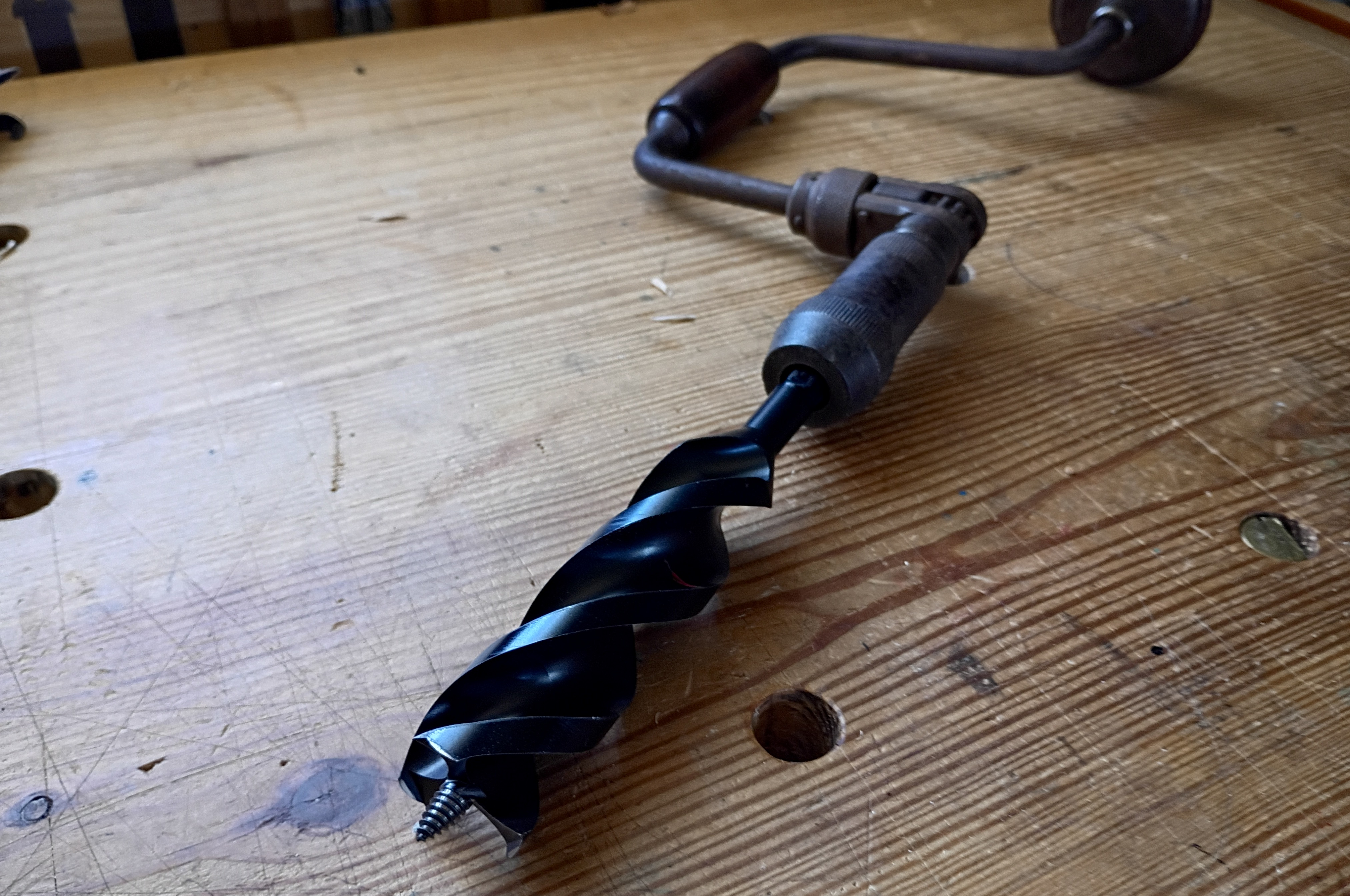 Above is a short video clip of the bit in action with a hand brace. The bits also come in longer lengths. The lead screw is excellent and the three cutting edges sheer the end grain well. Still, if you had several holes to bore, especially with the larger 1 1/2″ bit, your elbow will feel the stress eventually.