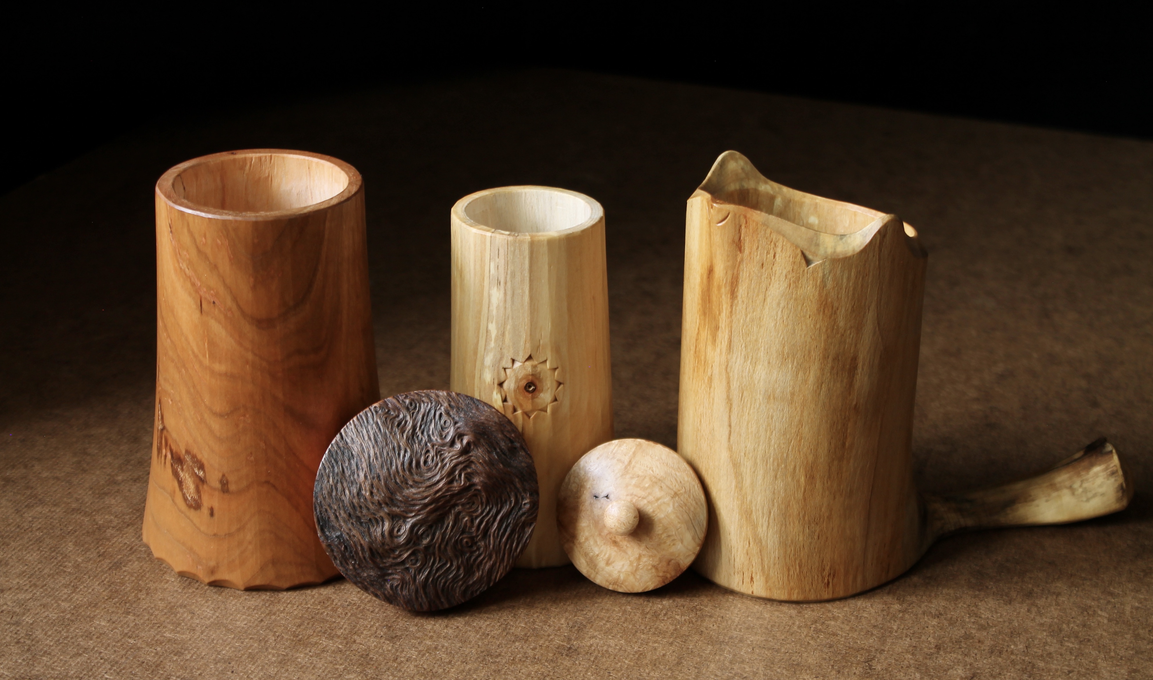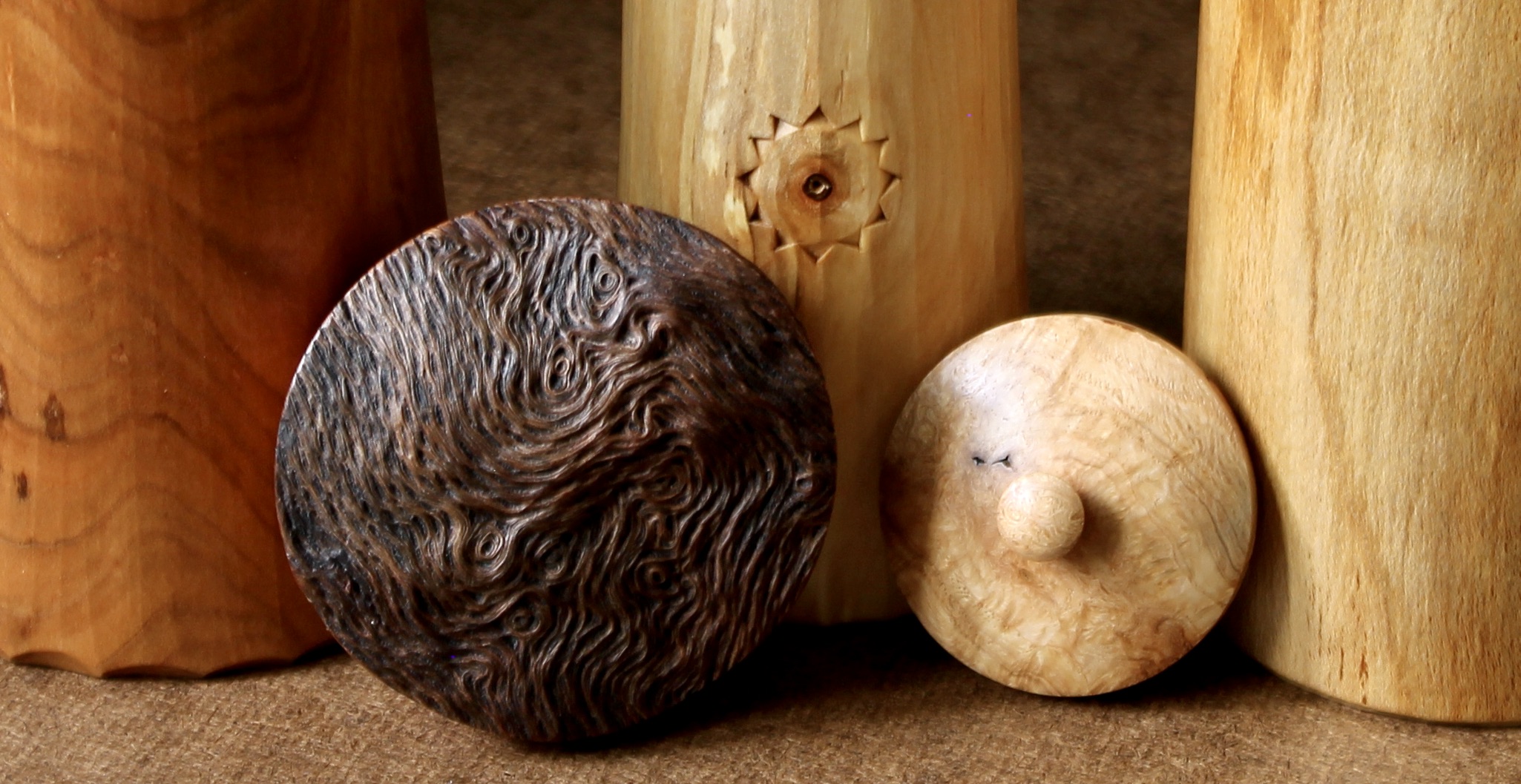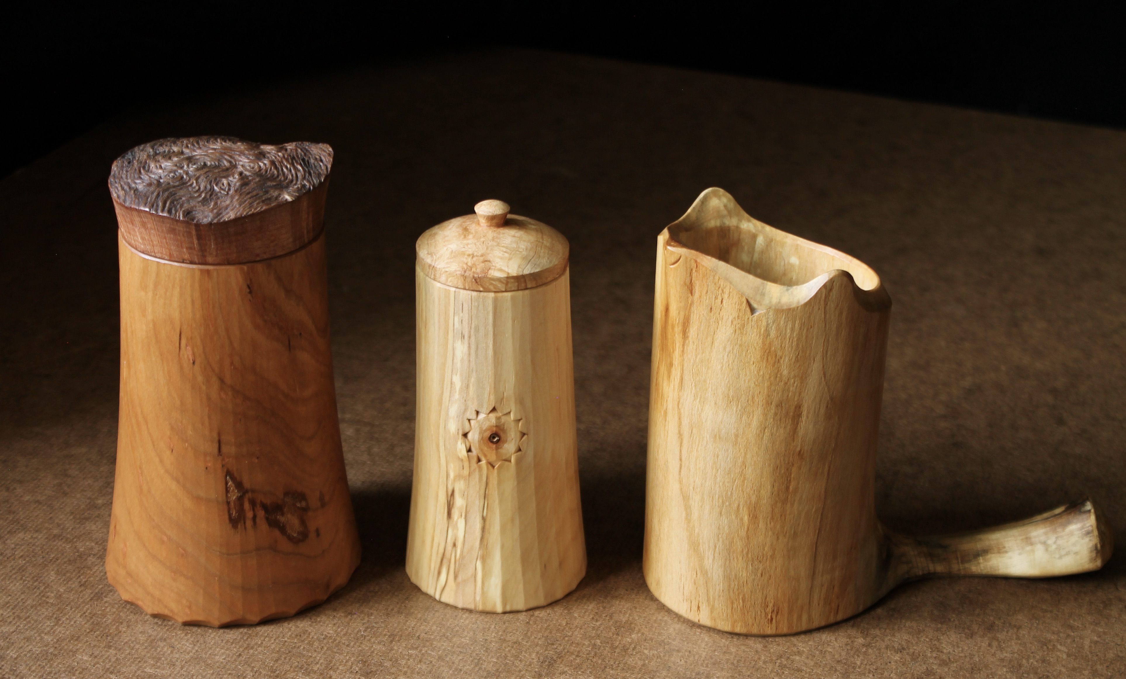 2: 5 3/8″ high x 2 1/2″. Maple with a little spalting. A rabbeted lid turned from a burly bit of found oak. The pin knot inspired me to carve a ring of chip-carving around it. Might be a nice size for holding salt or loose tea. $375 includes shipping.