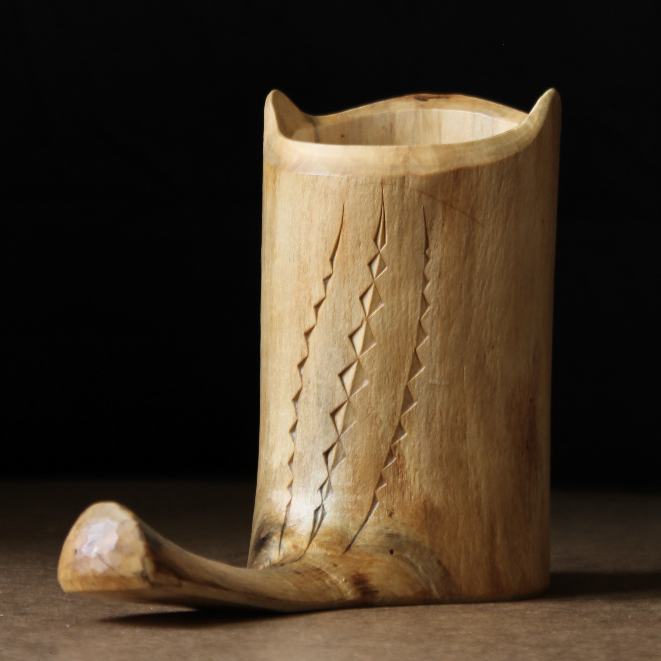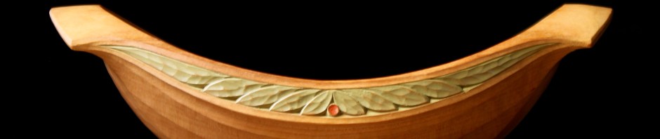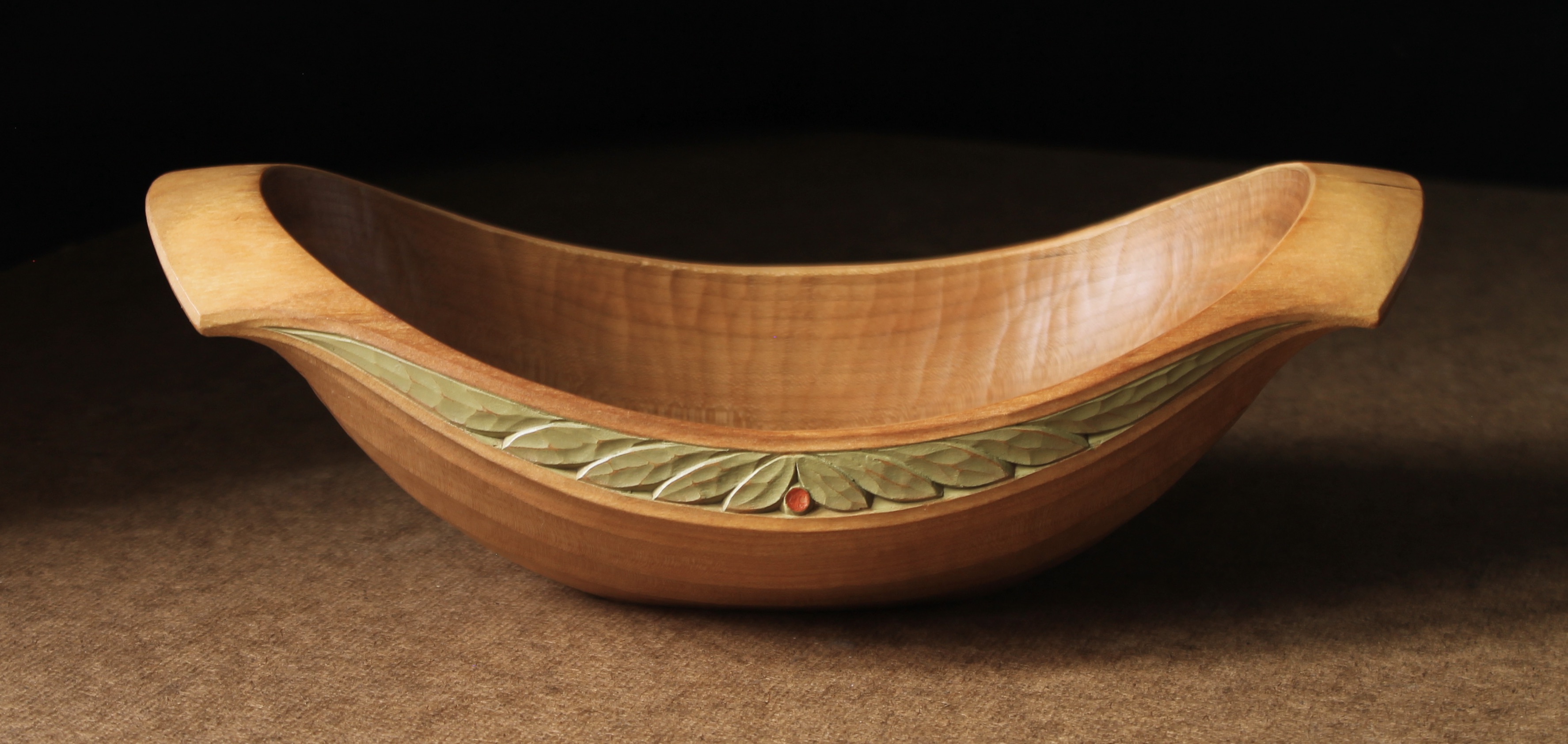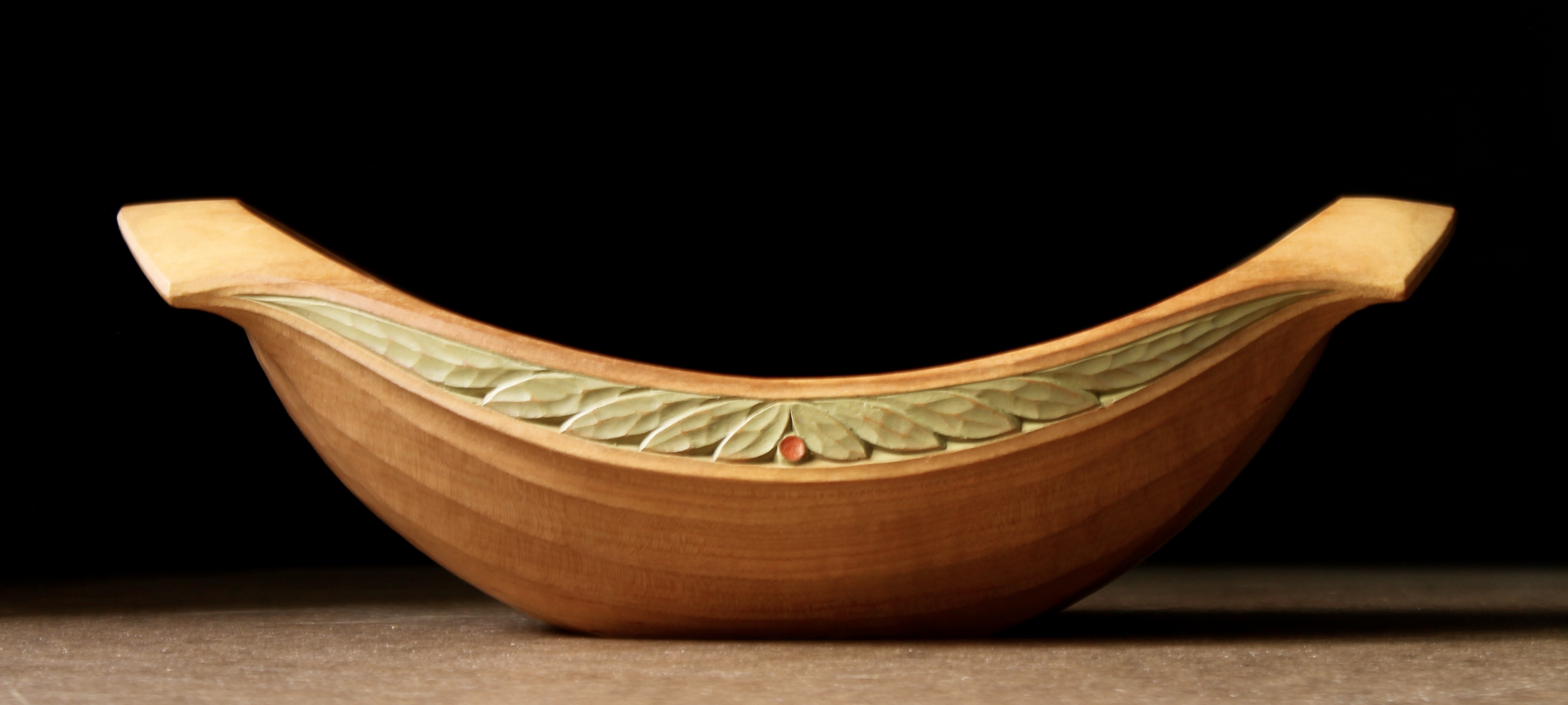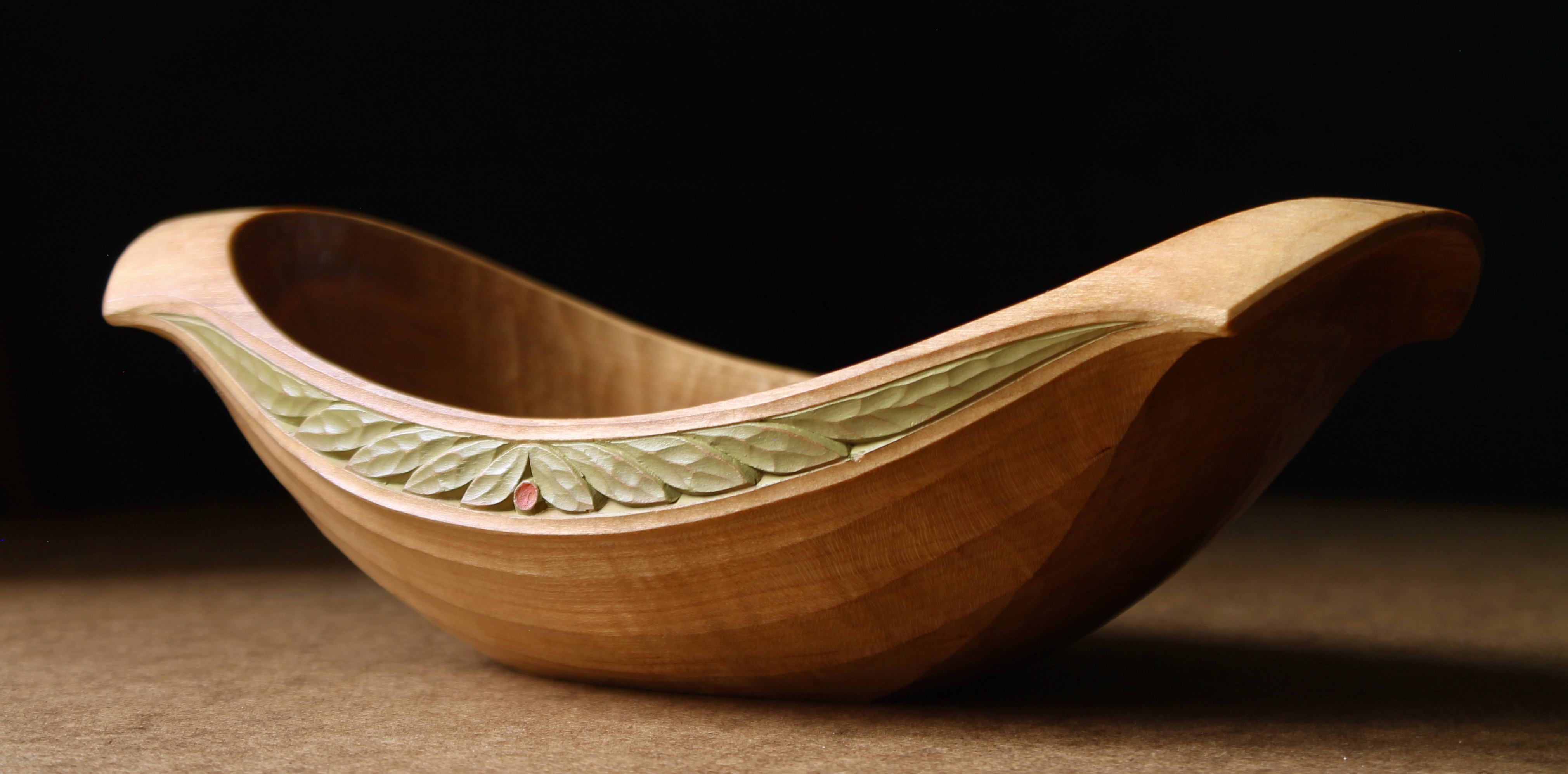 I’ve carved this leaf motif in various forms on several bowls over the years. This time, I painted the leaves with milk paint then rubbed it back slightly to highlight the high points of the carving. The contrast between the the paint and the surrounding wood will be enhanced as the color of the cherry deepens over the coming months and years.
