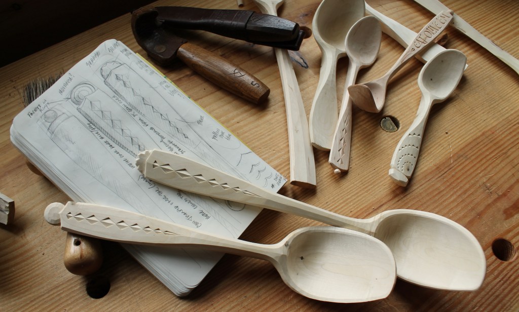 Then I started working down into the bark side of the inner bend and drew a general layout for a spoon it could hold. Then the usual axe and knife work.