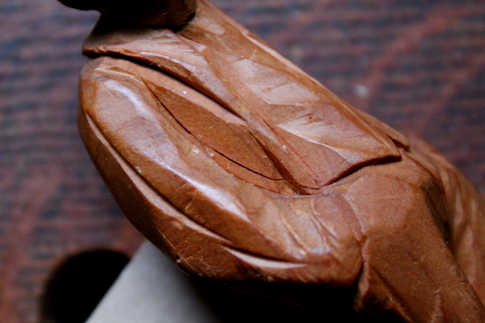 The sweeping knife overcut indicates Caron’s two-cut method for removing the wedge of wood between the arm and body.