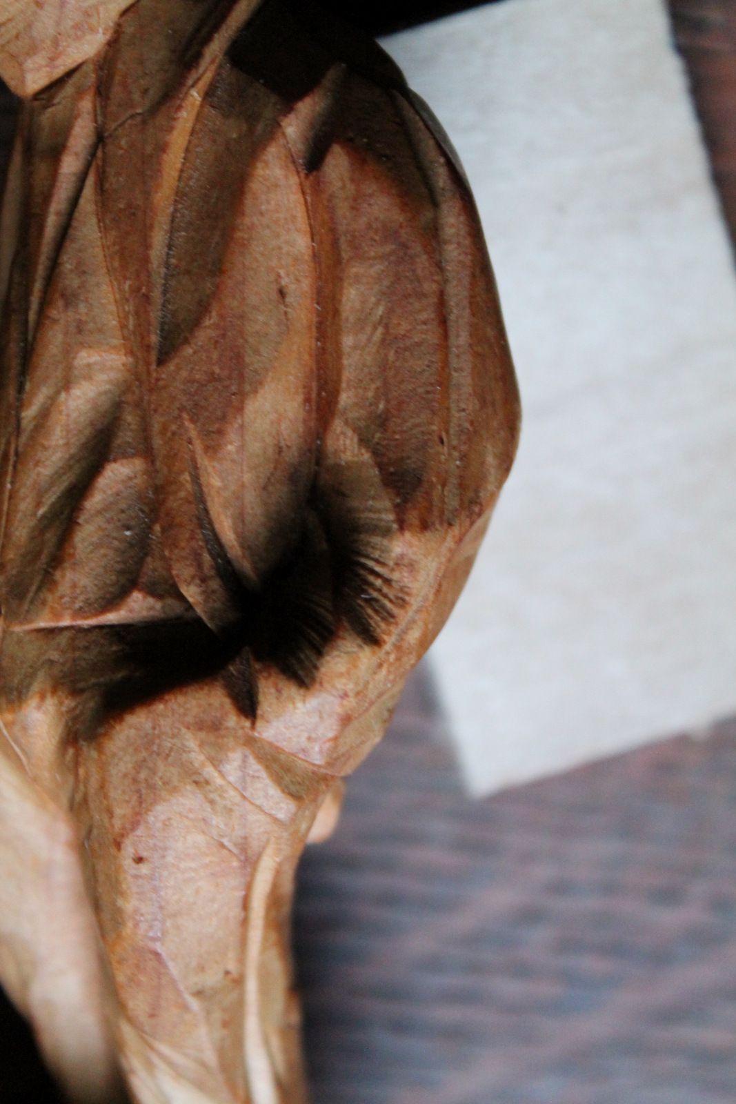 The chatter marks resulting from the knife blade twisting through the tight cut are left strategically and purposely to enhance the shadows of the folds in the cloth.