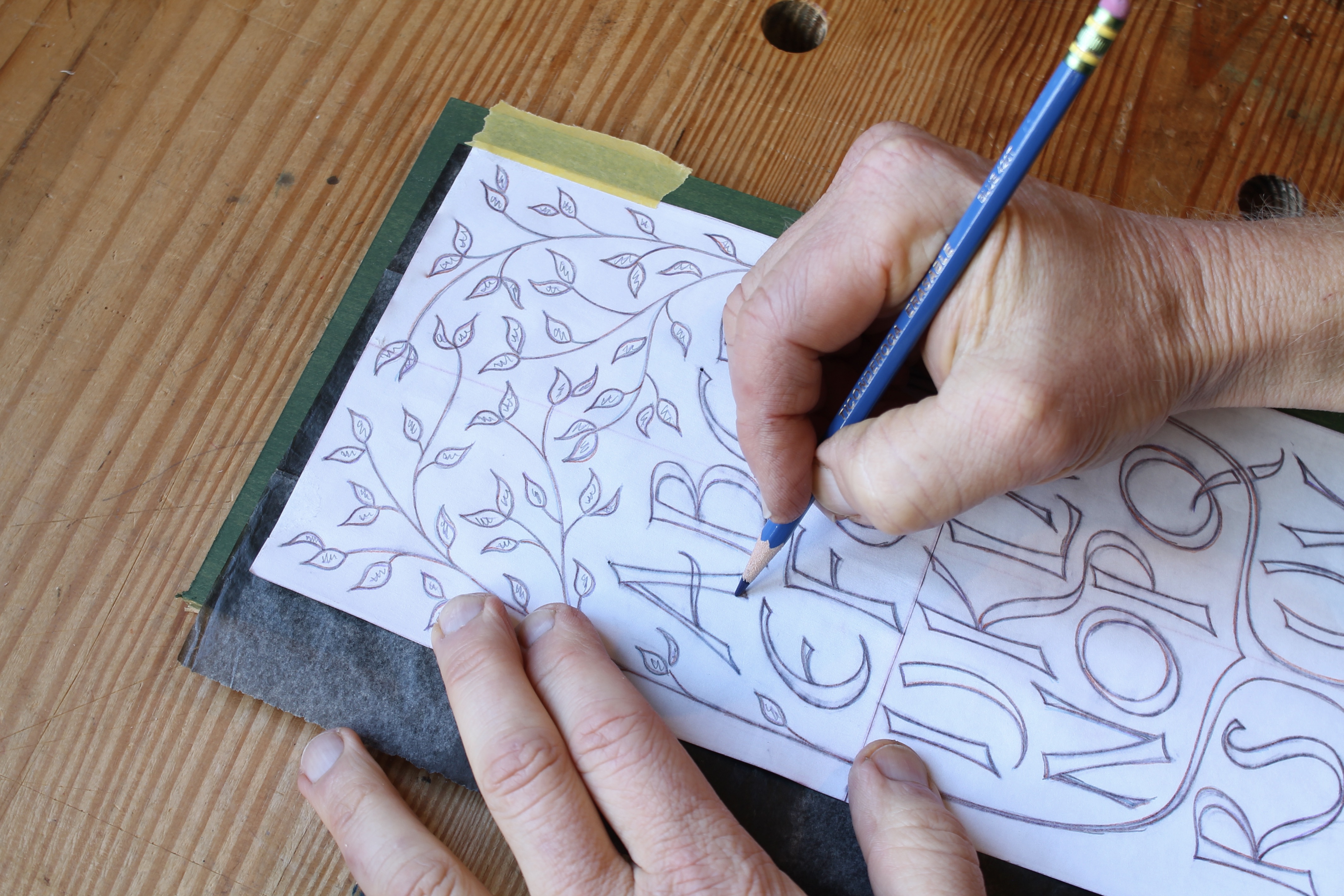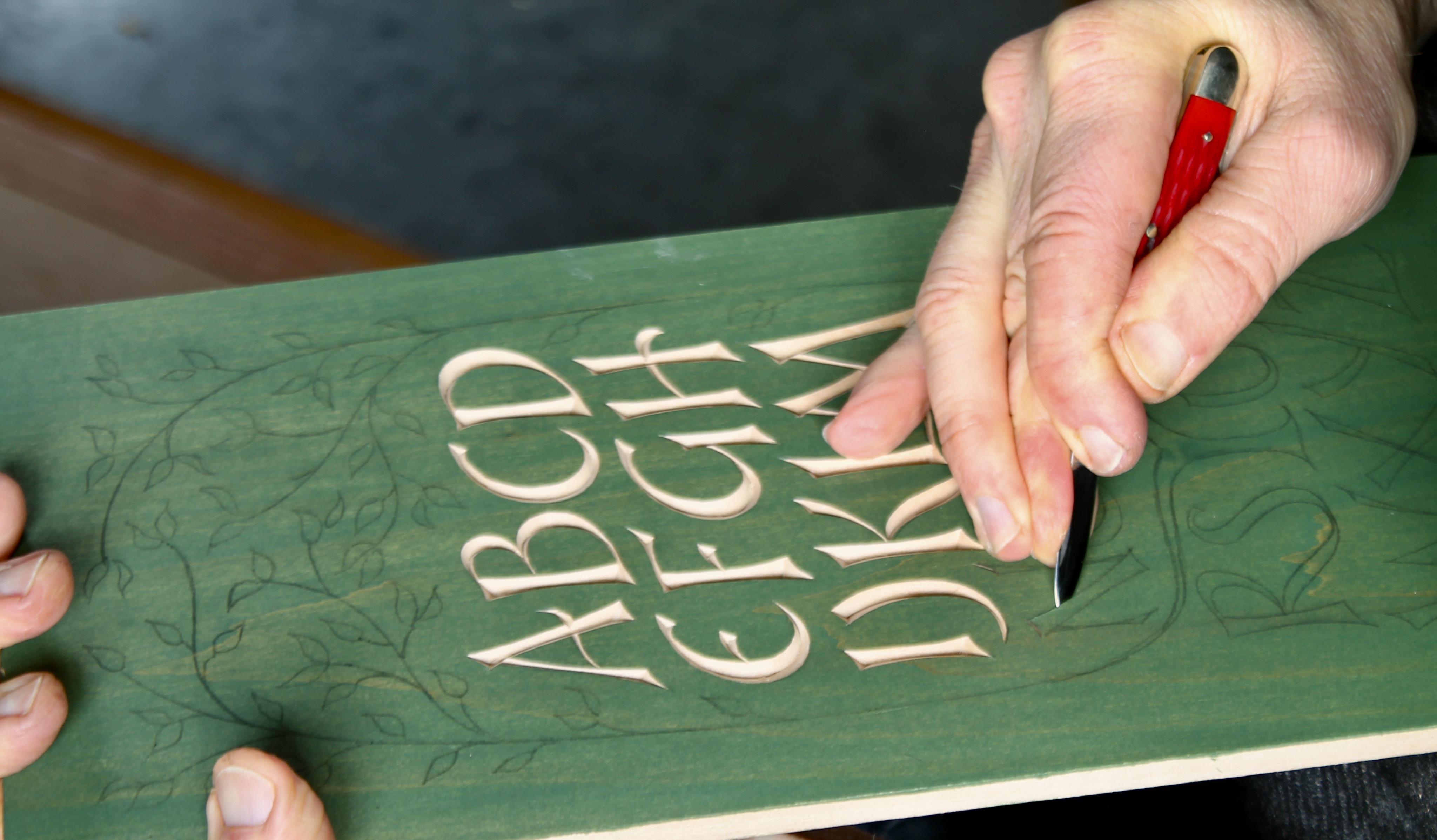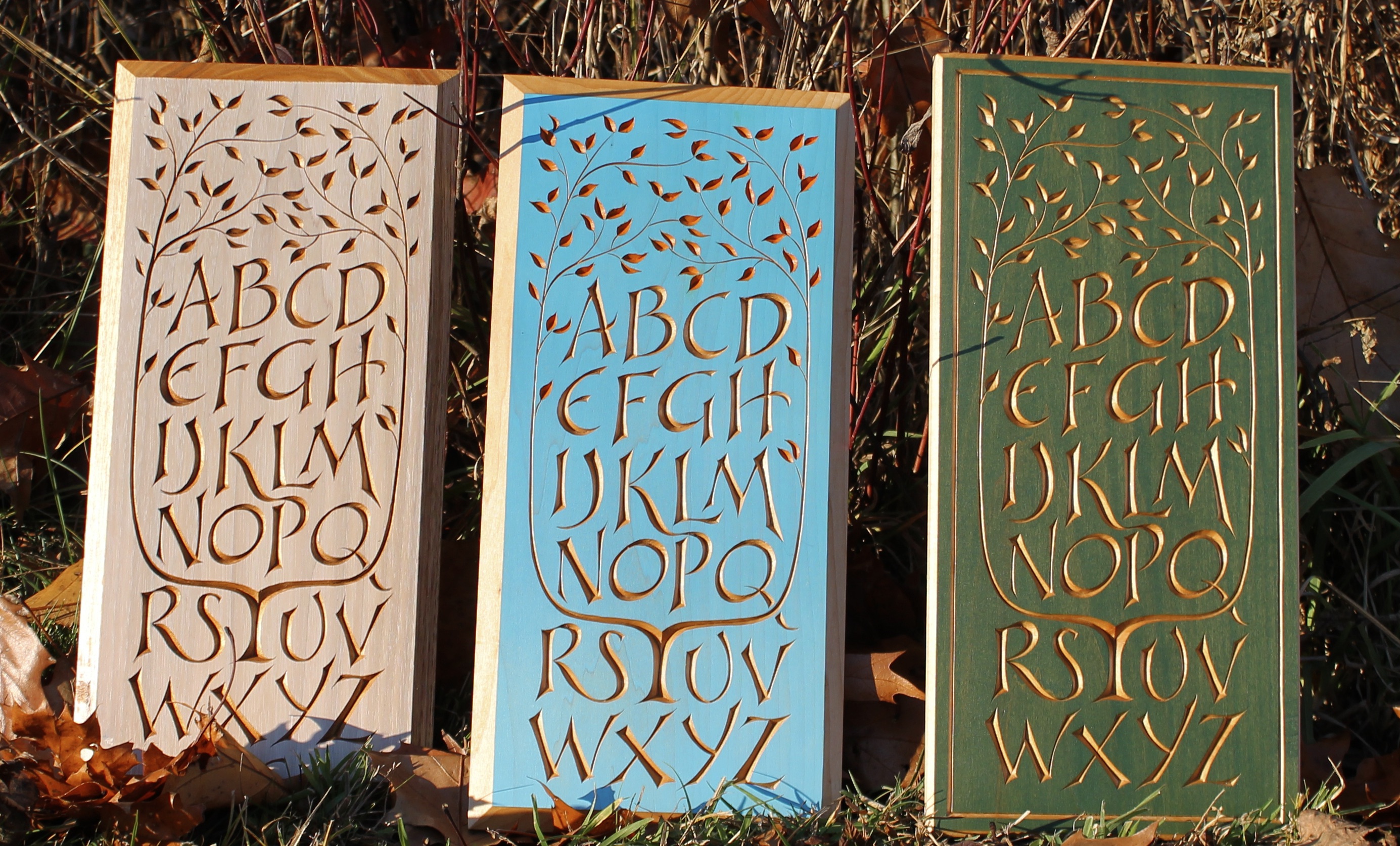 There are many possibilities for adding color to this design. Letters and/or leaves can be painted after carving, for example. One technique I’ve used a lot with this design is to color the surface of the wood before carving, then carve through it to reveal bare wood. Then again, no color at all is needed. Carving creates it’s own contrast as the surfaces that catch light and shadow.