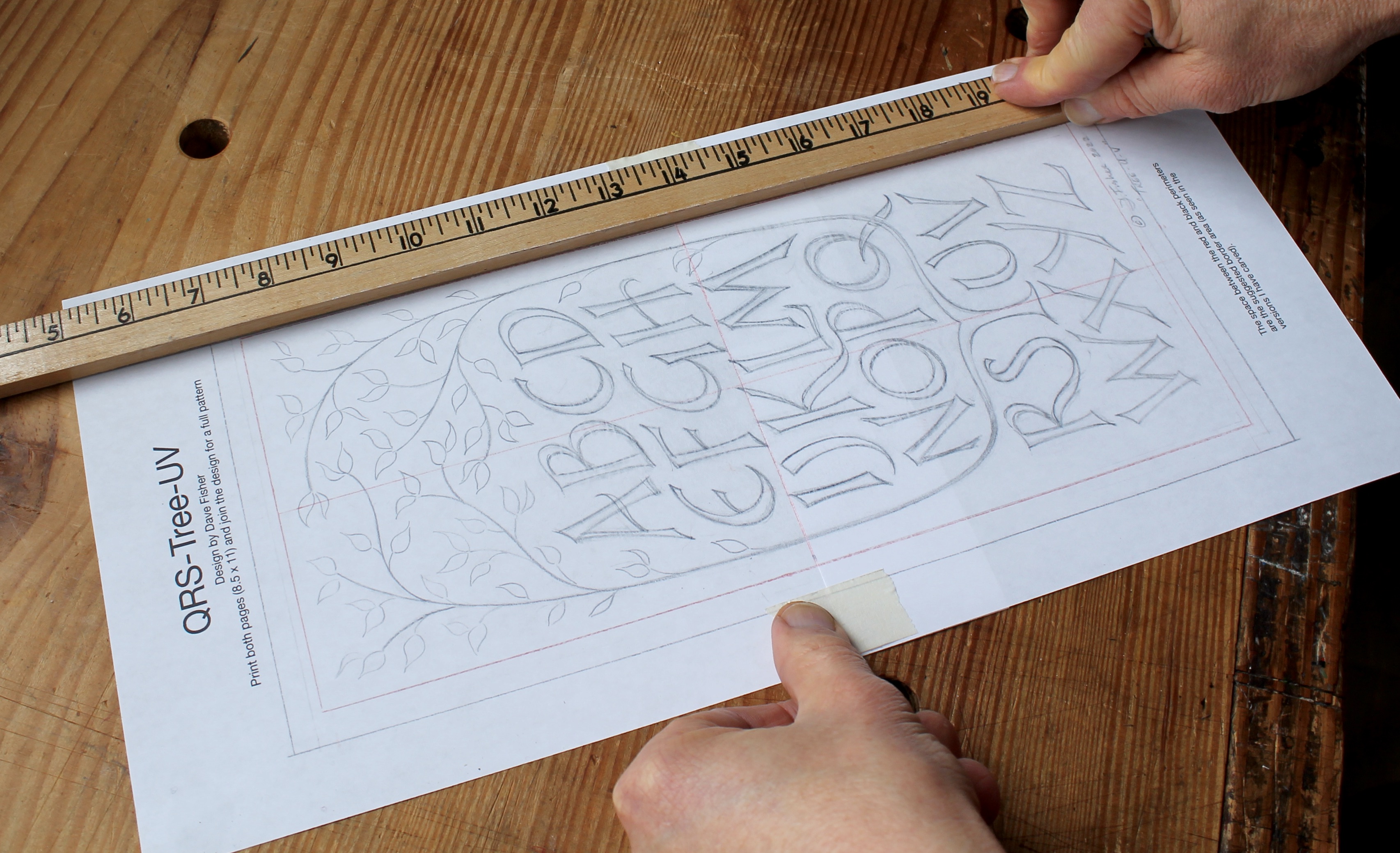I typically transfer the pattern to the wood by hinging the paper to the wood with some tape and slipping some wax-free graphite paper underneath. Your pattern will print out with an indication of borders and more paper surrounding the pattern. The one in the photo has been cut down and darkened by a few transfers.